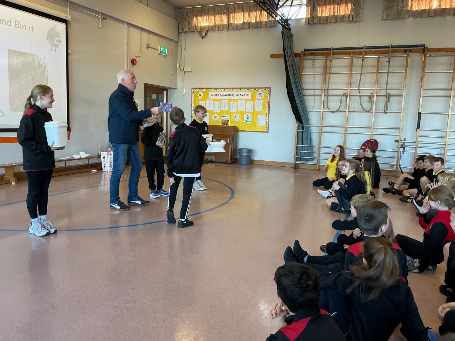 As well as giving the children a reusable water bottle, Pat also presented the ECO committee with a new water butt for the school.
